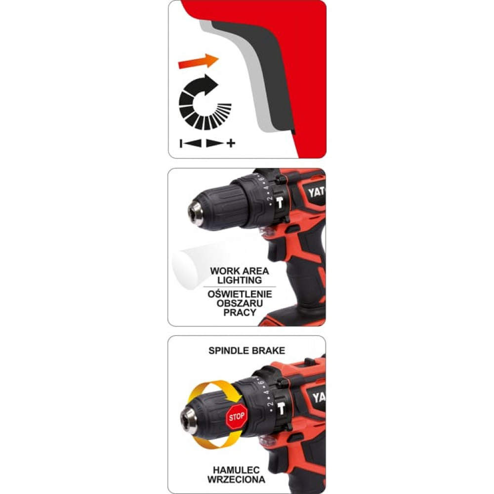 Erőteljes, sokoldalú 18V-os YATO csavarhúzó, tartós acélszerkezettel. Tökéletes fém és- fafúráshoz illetve csavarozáshoz.- 2 sebességes sebességváltó- Fokozatmentes sebességszabályozás- Kiváló minőségű LED-es lámpa a munkaterület megvilágítására- Orsófék, hogy megkönnyítse a fúrócserét- Gyors stop funkció- Ergonomikus fogantyú- 4 lépéses akkumulátor jelző- Akkumulátorcellák túlmelegedése elleni védelem- 18 voltos rendszer- A közös akkumulátor, a YATO akkumulátorcsaládhoz használható18 Voltos rendszerA 18 V-os rendszer egy sor YATO akkumulátoros szerszám, amely ugyanaz a tartós akkumulátorral működik. Mindegyik eszköz egy akkumulátorral, egy gyors töltővel vagy egy szólóval együtt vásárolható meg, ami ideális megoldás az eszközkészlet bővítésekor.Az akkumulátor tápellátása biztosítja a szabadságot és a munka kényelmét. Ráadásul a YATO vezeték nélküli eszközök tartósak, praktikusak és tökéletesen kiegyensúlyozottak. Így örömmel dolgozik velük minden profi szakember.Készlet tartalma:- Akkus csavarozó- Akkumulátor- Töltő- 18 V- tokmány: 13 mm- 2 sebessé 0-440 / 0-1650 RPM- Li-Ion akkumulátor- 40 Nm nyomaték- Munkaterület megvilágító lámpa- könnyített, kompakt változat- súly: 2,6 kg