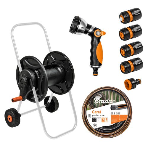 A készlet tartalma:1. DAILY fém kocsi:- rozsda-, korrózió- és UV-sugárzásálló- 60 m 1/2''-os kerti tömlő elhelyezését teszi lehetővé- egyszerű összeszerelés szerszámok nélkül- stabil és tartós talp- csúszásgátló kerekekkel rendelkezik- összecsukható tekerőkar csúszásgátló bevonattal2. CARAT 1/2"-os kerti tömlő - 20 mCARAT - 3 rétegű, megerősített kerti tömlő. Puha PVC-ből készült, megnövelt tömeggel és tartóssággal.I réteg - belső, fekete PVC-ből, amely ellenáll az UV-sugárzásnak és az algák lerakódásának a tömlőbenII réteg - szintetikus szálból készült keresztfonatIII réteg - külső, fekete, két narancssárga csíkkal, puha PVC-ből3. BLACK LINE szerelvények:- 3x 1/2''-os BLACK LINE gyorscsatlakozó- 1x 1/2''-os BLACK LINE gyorscsatlakozó ütközővel- 1x csapcsatlakozó 3/4''-os szűkítővel - 1/2''-os BLACK LINE- 1 x 8 funkciós BLACK LINE szórópisztoly