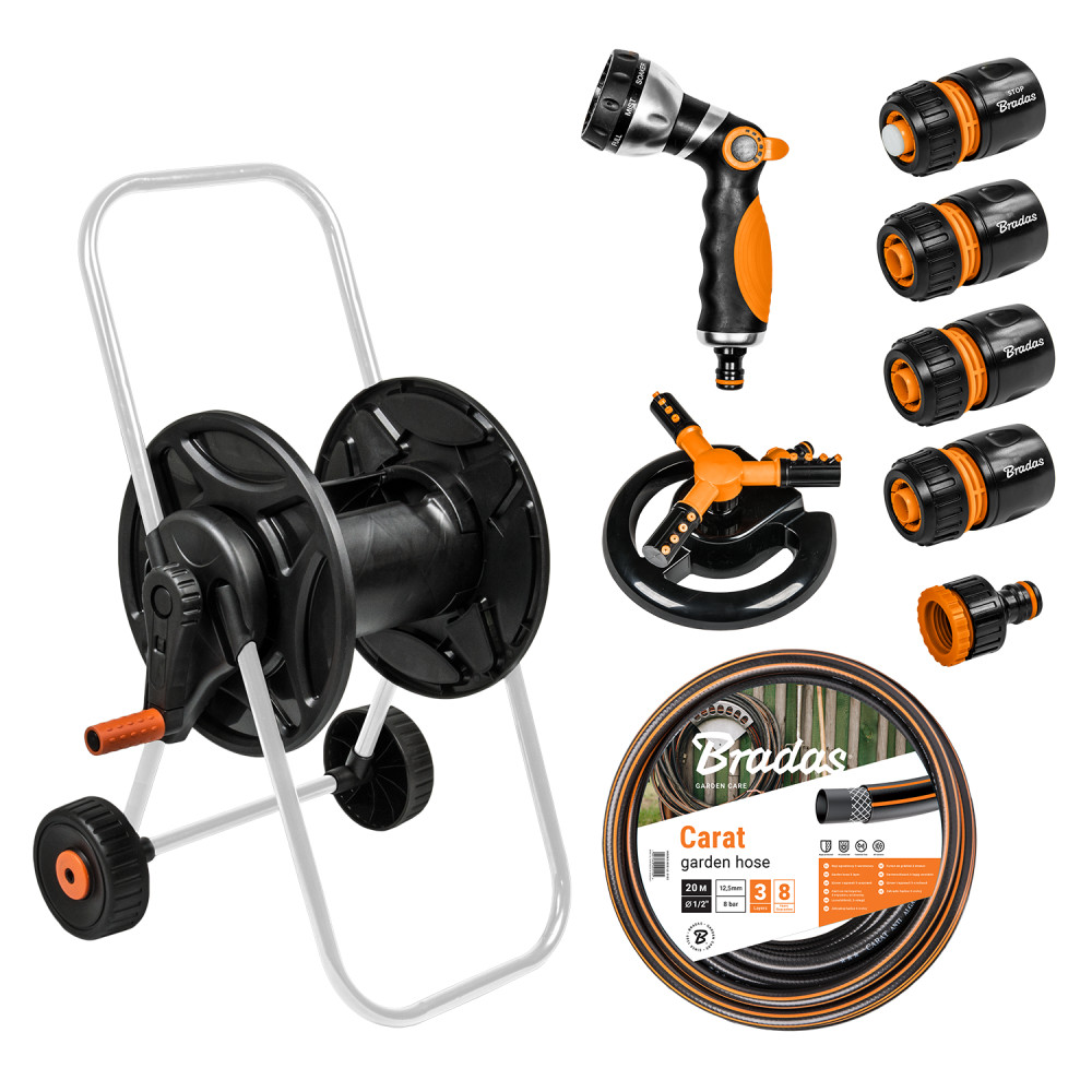 A készlet tartalma:1. DAILY fém kocsi:- rozsda-, korrózió- és UV-sugárzásálló- 60 m 1/2''-os kerti tömlő elhelyezését teszi lehetővé- egyszerű összeszerelés szerszámok nélkül- stabil és tartós talp- csúszásgátló kerekekkel rendelkezik- összecsukható tekerőkar csúszásgátló bevonattal2. CARAT 1/2"-os kerti tömlő - 20 mCARAT - 3 rétegű, megerősített kerti tömlő. Puha PVC-ből készült, megnövelt tömeggel és tartóssággal.I réteg - belső, fekete PVC-ből, amely ellenáll az UV-sugárzásnak és az algák lerakódásának a tömlőbenII réteg - szintetikus szálból készült keresztfonatIII réteg - külső, fekete, két narancssárga csíkkal, puha PVC-ből3. BLACK LINE szerelvények:- 3x 1/2''-os BLACK LINE gyorscsatlakozó- 1x 1/2''-os BLACK LINE gyorscsatlakozó ütközővel- 1x csapcsatlakozó 3/4''-os szűkítővel - 1/2''-os BLACK LINE- 1x 8 funkciós BLACK LINE szórópisztoly- 1x 3 karú állítható forgó öntözőfej BLACK LINE