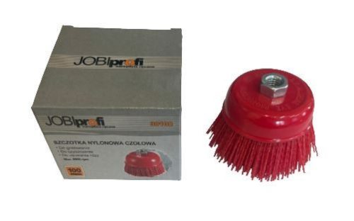 A JOBIPROFI márkájú homlokkefe (más néven csészés vagy korongkefe) nejlon sörtékkel készült, és M14-es menettel csatlakoztatható elektromos vagy pneumatikus csiszológépekhez, illetve sarokcsiszolókhoz.A 100 mm-es átmérő kompakt méretet biztosít, amely ideális kisebb, nehezen hozzáférhető felületek tisztításához.