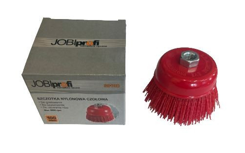 A JOBIPROFI márkájú homlokkefe (más néven csészés vagy korongkefe) nejlon sörtékkel készült, és M14-es menettel csatlakoztatható elektromos vagy pneumatikus csiszológépekhez, illetve sarokcsiszolókhoz.A 75 mm-es átmérő kompakt méretet biztosít, amely ideális kisebb, nehezen hozzáférhető felületek tisztításához.