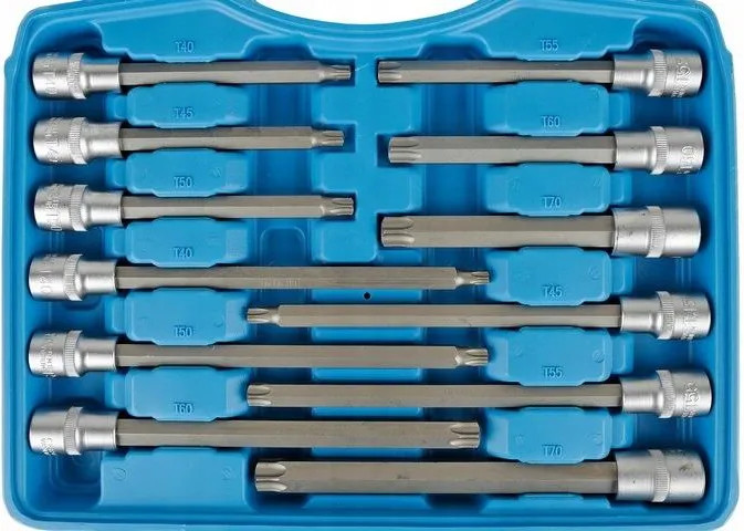 A bitek rendkívül tartós CrV acélból készültek. Minden bithez 1/2"-os racsnis dugókulcs tartozik.