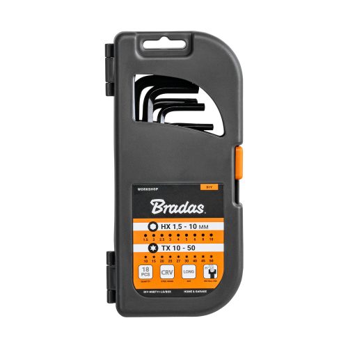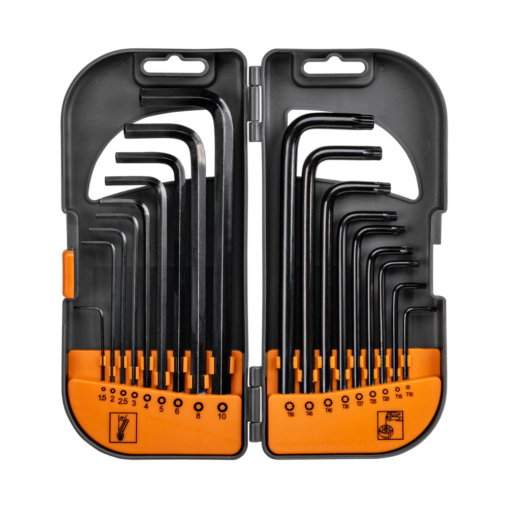 Ez az imbusz- és TORX kulcskészlet a tartósságot, a kényelmet és a sokoldalúságot ötvözi. Hosszú kialakításának és praktikus gömb alakú hegyének köszönhetően könnyen hozzáférhet még a nehezen elérhető helyekhez is. Megbízható eszköz minden barkácsoló és szakember számára.Műszaki adatok Készlettípusa : 9 db imbuszkulcs golyóval és 9 db TORX kulcsElemek száma: 18 db. HEX méretek: 1,5 / 2 / 2,5 / 3 / 4 / 5 / 6 / 8 / 10 mmTORX méretek: T10 / T15 / T20 / T25 / T27 / T30 / T40 / T45 / T50Anyag: króm-vanádium acél (CRV)Bevonat: fekete - fokozott ellenállás a korrózióval és a sérülésekkel szembenKialakítás: hosszú kulcsok a kényelmesebb munkavégzéshezCsomagolás: praktikus dobozTermékjellemzők A CRV acélmasszív szerkezete hosszú élettartamot biztosítA HEX kulcsok gömbfejei akár 25 fokos szögben is lehetővé teszik a munkátKopásálló fekete bevonatPontosan kiválasztott méretek Széleskörű alkalmazásokhoz· Masszív doboz a kényelmes tároláshoz és szállításhozAlkalmazások· Professzionális autó- és szervizműhelyek· Mechanikus és elektronikus alkatrészek összeszerelése és szétszerelése· Kerékpár-, motorkerékpár- és sportfelszerelések szervizelése· Karbantartási és javítási munkák otthon és a garázsban· Ideális barkácsolók és szakemberek számára