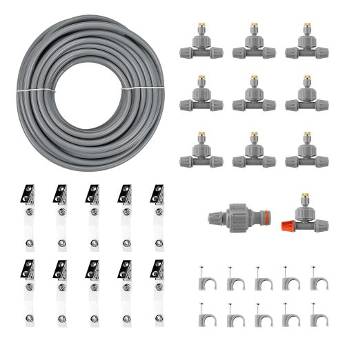 A készlet tartalma:• 15 m tömlő• 1 db gyorscsatlakozó adapter szűrővel• 9 db sárgaréz szórófej• 1 db sárgaréz szórófej végzáróval• 10 db tömlőrögzítő konzol• 10 db tömlőrögzítő bilincs• Csomagolás típusa: színes dobozJellemzők:• A párásítási szög beállítása